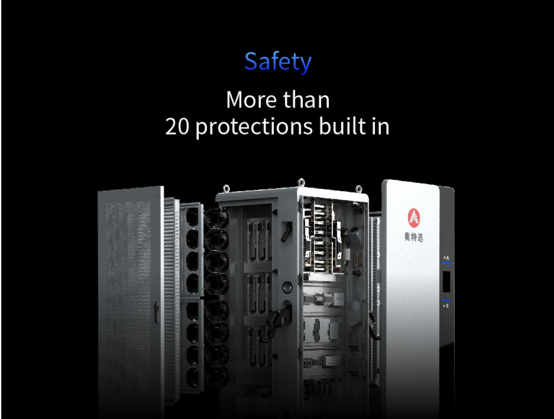20 Protections from emergency stop, short-circuit, ground fault, control guiding signal fault, battery reverse connection, battery group overvoltage, battery unit overvoltage, battery group overtemperature, battery group/BMS fault, gun overtemperature, charging module overtemperature, overcurrent, auxillary power fault, residual voltage, EV voltage fault, dispenser overtemperature, insulation fault, sample fault, busbar fault, module allocations fault, etc.